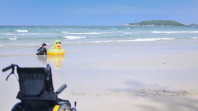 These equipment and volunteers on the Dalia beach are part of an initiative aimed at supporting people with special needs who want to swim.
