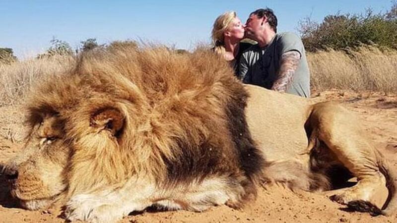 A Canadian couple happily kissed as they posed for a photo next to a lion they had just killed while on a safari in South Africa.