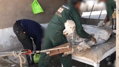 The footage shows animals being tied up by their front and back legs and winched out until they are lying flat so their coats can be trimmed.