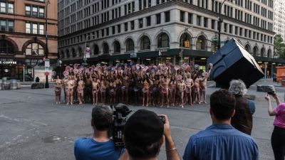 In collaboration with the National Coalition Against Censorship, for their #WeTheNipple campaign, Tunick took photos of the models during a Sunday morning demonstration outside the Astor Place subway station in Manhattan.