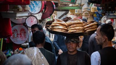 A trader carries a tray of bread on his head through one of the packed local markets in Kabul. Thijs said: 'People are going to their work and trying to get by and not sit around and feel miserable and mope all day about their situation'  (dailymail.co.uk/Thijs Broekkamp)