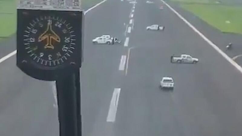 Footage shows dozens of security vehicles on the runway, making it impossible for aircraft to land.