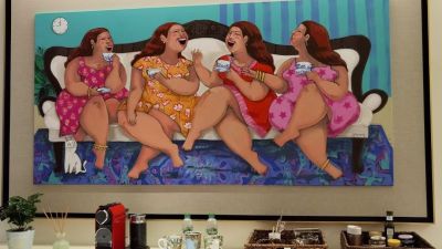 This 2020 painting is typical of Zidan’s exuberant, colorful and loving portrayal of the female form (her Master’s degree was on “Human Anatomy for Artists”). The 30-year-old Egyptian artist began depicting plus-size women as a response to the “unrealistic beauty standards” of Instagram, she once told Cairo West magazine. “The most important point is that I portrayed them feeling happy and satisfied. I want every woman to feel accepted and confident about how she looks.” In another interview, with Executive Woman magazine, she said: “We aren’t supposed to look alike. Everyone is different, and every woman is enough the way she is.”