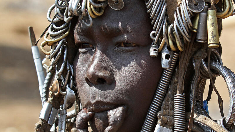 The women of the Suuri Baale tribe, who live to the west of the Omo Valley in Ethiopia, have their two lower teeth removed and their bottom lip sliced at the age of 12 in order to squeeze in the huge clay plate, which helps attract a wealthy husband. A man's worth in the indigenous tribe is measured by the number of cows he owns.