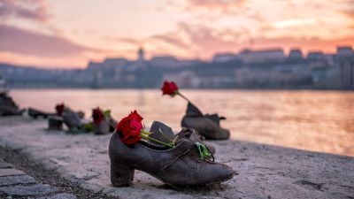 "Shoes on the Danube bank" - Monument as a memorial of the victims of the Holocaust during WWII on the bank of the Danube at sunset in Budapest, Hungary (Shutterstock)