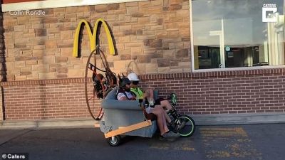 Two friends stunned customers and staff at a McDonald's drive-thru after they arrived to buy food in a fan-powered sofa.