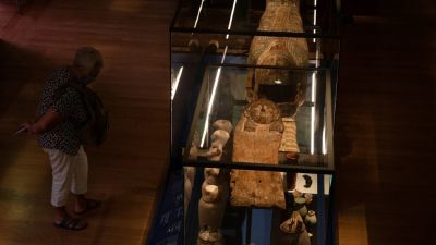 Visitors looks at a sarcophagus with a mummy inside during the exhibition "Pharaon, Osiris and mummy" at the museum Granet in Aix-en-Provence, southeastern France, on September 18, 2020. The exhibition will take place from September 19 until February 14 2021. Christophe SIMON / AFP
