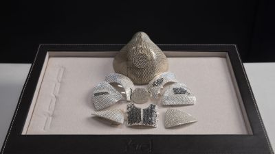 The mask is constructed with 18-karat white gold mask will be decorated with 3,600 white and black diamonds. (Twitter)