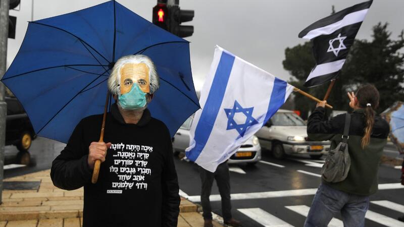 A man holding an umbrella, wearing a protective face mask beneath another mask showing the face of late physicist Albert Einstein, and a hoodie sweater quoting a verse from the biblical book of Isaiah, while another waves an Israeli flag and another Israeli flag with the colours inverted during a protest outside the Knesset (parliament) in Jerusalem on March 19, 2020. AFP/File