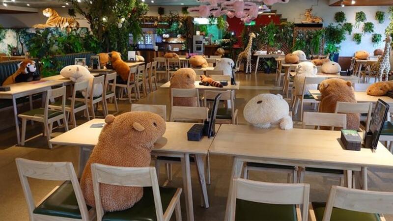 While the majority of the plush animals in the cafe are capybaras, other animals such as giraffes, tigers and what looks to be red pandas are also seated in the cafe.