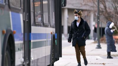 A man in a mask boards a bus on campus at Western University in London, Ontario on March 13, 2020 where in person classes have been suspended for the rest of the school year in favour of online instruction due to concerns over the the novel coronavirus, COVID-19. Geoff Robins / AFP