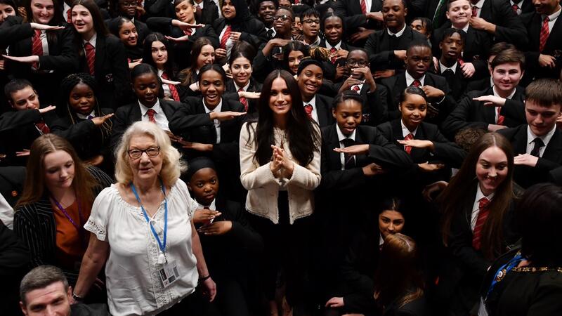 Although rumours had spread about the identity of their special guest, most of the pupils waiting inside and onlookers gathered at the school gates were audibly surprised when Meghan arrived on Friday, to be warmly greeted by headteacher Russell Taylor.