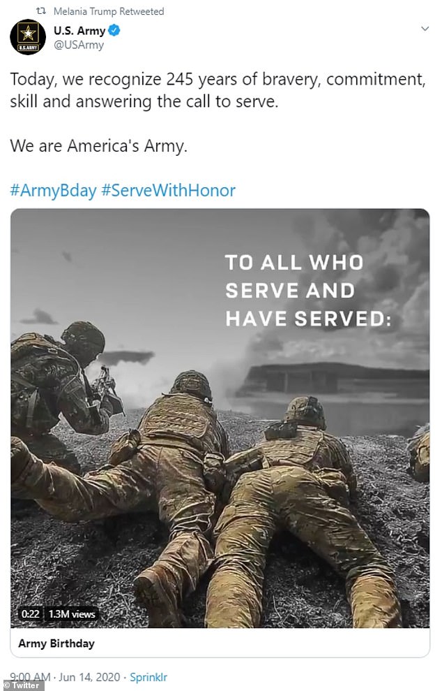 And despite not marking her husband's big day Melania did, however, mark one anniversary, retweeting a birthday message to the Army.