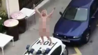This is the bizarre moment a naked woman jumps on top of a police car after being released following a court appearance for flouting Spain's coronavirus lockdown.