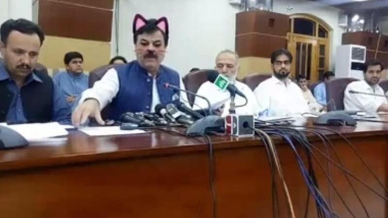 A politician in northwestern Pakistan was given paws for thought after his press conference was streamed live on Facebook with the "cat filter" turned on, giving him on-screen whiskers and ears.