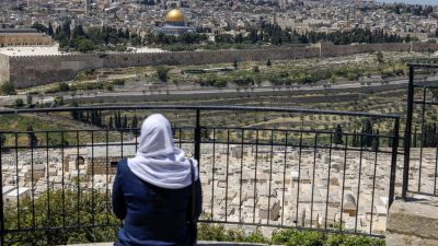 A Palestinian woman looks from the Mount of Olives at the Old City of Jerusalem and the closed-down Aqsa Mosque compound, after the second Friday prayer of the Muslim holy month of Ramadan, on May 1, 2020, amid heightened security and social distancing measures due to the COVID-19 pandemic. AHMAD GHARABLI / AFP