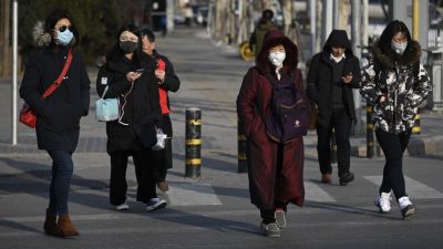 Pedestrians wearing masks cross a street in Beijing on January 21, 2020. The number of people in China infected by a new SARS-like virus jumped to 291 on January 21, according to authorities.  WANG Zhao / AFP