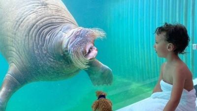 The clip shows a young guest in the room relaxing against pillows and a furry throw as a playful walrus swims right up to the glass.