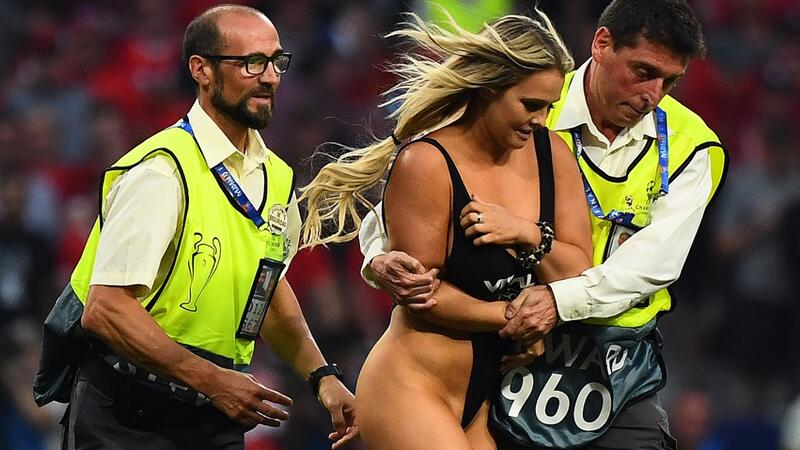 A pitch invader wearing a skimpy swimsuit advertising a Russian porn pranking website had to be escorted off the pitch by security during the Champions League final.