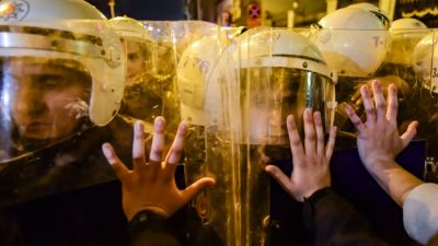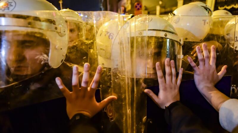 Turkish anti-riot police officers push back women during a rally marking International Women's Day on Istiklal avenue in Istanbul on March 8, 2020. Istanbul police fired tear gas at thousands of women who took to the city's central avenue on International Women's Day on March 8 in defiance of a protest ban to demand greater rights and denounce violence. Yasin AKGUL / AFP
