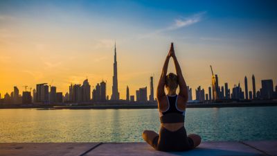 Young yogi woman doing sunset yoga with Dubai skyline view. (Shutterstock)