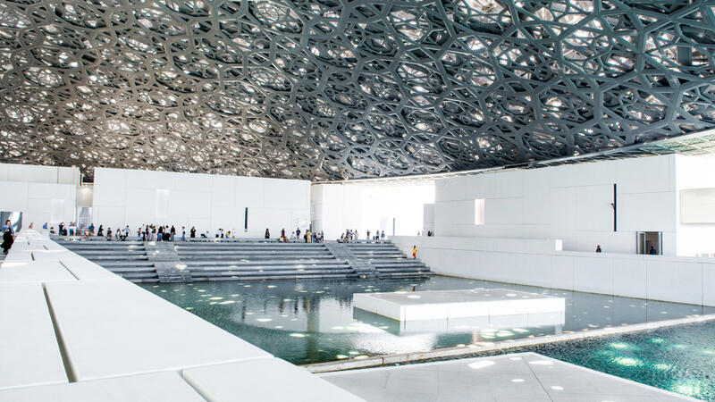 The Louvre Abu Dhabi Museum displays examples of humanity’s cultural achievements from prehistoric times to today. It covers 6,000 sq.metres of galleries and exhibitions, in addition to a research centre.