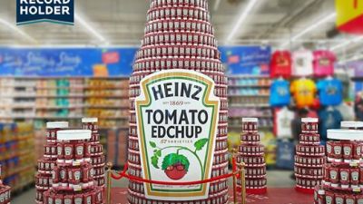 Carrefour, which collaborated with Heinz to create the ketchup tower, was awarded the Guinness World Record for the tallest packaged food display after 52 volunteers spent more than 48 hours constructing the tower.