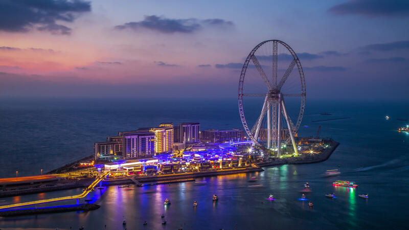 The Ferris wheel towers 250 metres over the Bluewaters island, giving 360-degree views of Dubai's famed skyline.