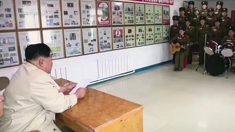 This bizarre footage shows a band of North Korean female soldiers singing and dancing for strongman Kim Jong-un.