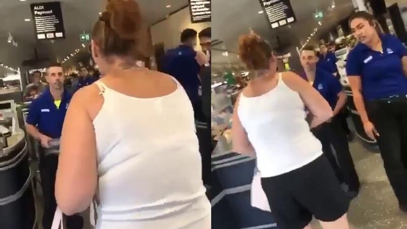 An irate Aldi shopper has coughed in a worker's face after going on an explosive rant at the check out.