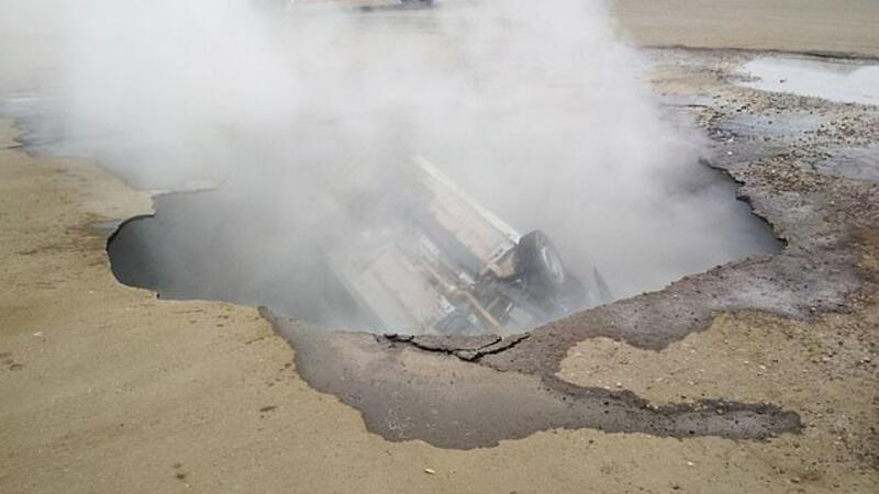 This is the moment two men were boiled alive in Russia after driving into a sinkhole filled with scorching water.