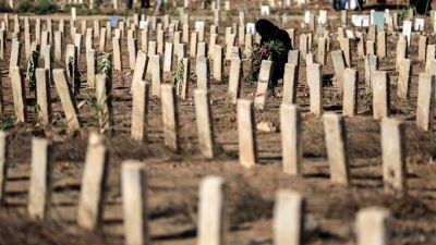 The footage was recorded in a graveyard in Khan al Sebel village, located south of war-torn Idlib, according to the Syrian Network for Human Rights (SNHR).