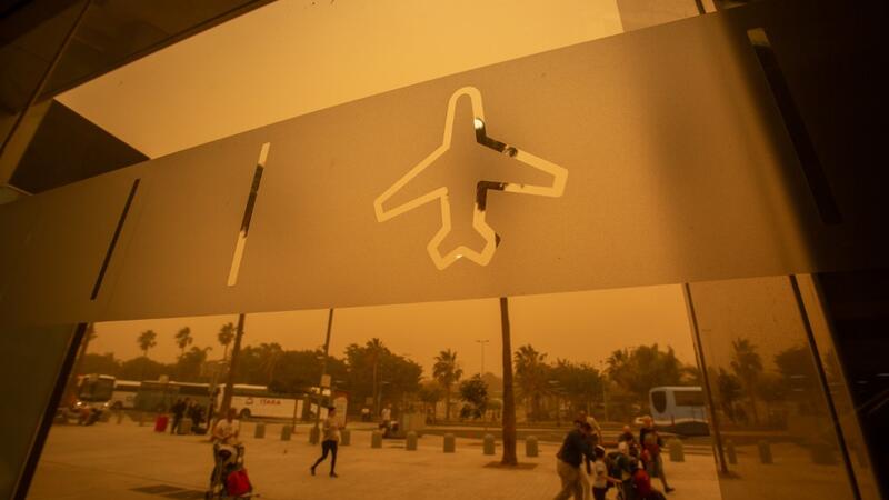The footage shows the full intensity of the Saharan sandstorm as planes can hardly be seen through the yellow haze.