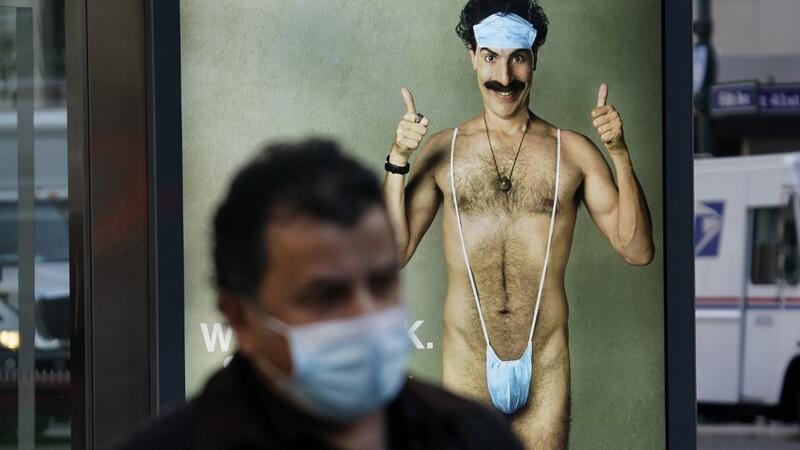 In this file photo taken on October 15, 2020, person wearing a mask walks past a bus stop ad on October 15, 2020, for the upcoming movie "Borat 2," featuring actor Sacha Baron Cohen, ahead of its release on October 23. US President Donald Trump said he has not been a fan of Sacha Baron Cohen, even before a clip from the British comedian's new Borat movie forced the US president's lawyer Rudy Giuliani into an awkward explanation. Asked about the clip, which shows Giuliani in a faked "interview" with an attractive and flirtatious young woman, while speaking to journalists on October 23, 2020, aboard Air Force One, Trump said: "I don't know what happened." TIMOTHY A. CLARY / AFP