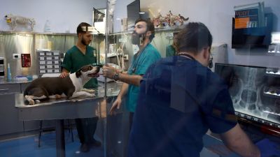 Alaa Shehadeh, director of Vetzone, checked his monitors as he and his colleagues examined Navy, a Pitbull partially paralyzed due to a spinal disc problem.