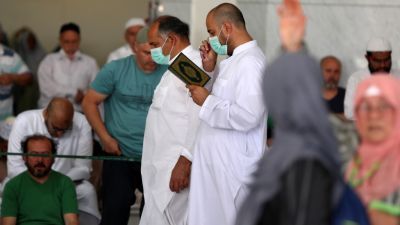 Worshippers, some of them wearing protective masks, take part in the Friday prayers in front of Mecca's Grand Mosque on March 6, 2020, a day after Saudi authorities emptied Islam's holiest site for sterilisation over fears of the new coronavirus COVID-19, an unprecedented move after the kingdom suspended the year-round umrah pilgrimage. Abdel Ghani BASHIR / AFP