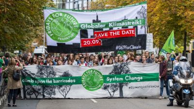 Participants of a Fridays for Future demonstration walk with protest signs and banners through Frankfurt on September 13, 2019. On the occasion of the International Auto Show (IAA), demonstrations will be held for sustainable mobility. (Lennart Stock / dpa / AFP)