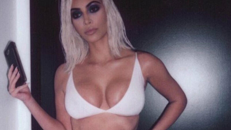 Amplifying the glamour, Kim's white, blonde tresses are worn in a wet look style around her face, which models a dramatic smokey eyeshadow look.