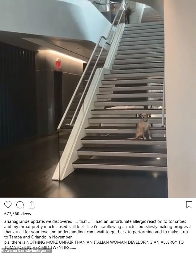 The 25-year-old singer, who shared the news with a clip of her dog sitting on a flight of stairs, wrote on her Instagram: 'update: we discovered .... that .... I had an unfortunate allergic reaction to tomatoes and my throat pretty much closed.'