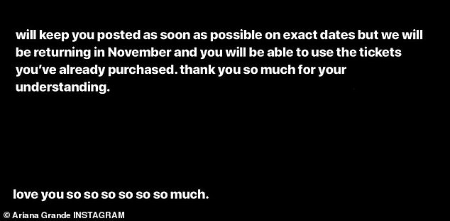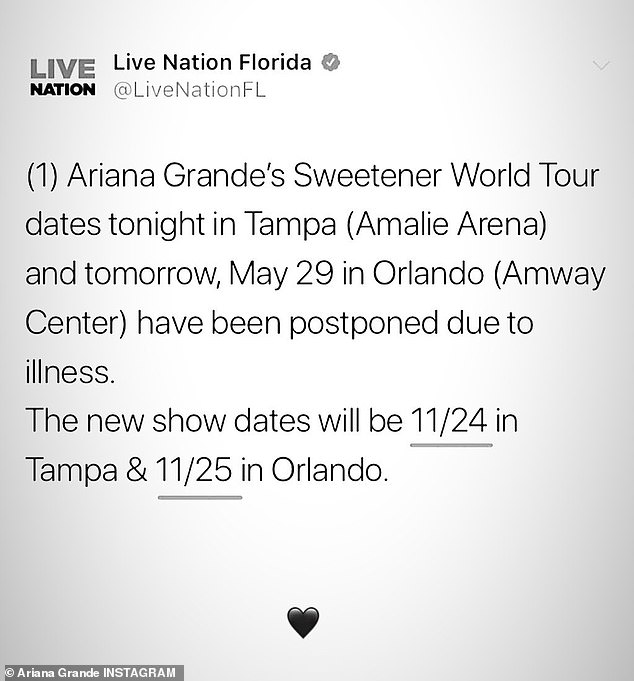 Soon after Ariana told fans the news of two shows being postponed, Live Nation tweeted the rescheduled dates: November 24 in Tampa and November 25 in Orlando.