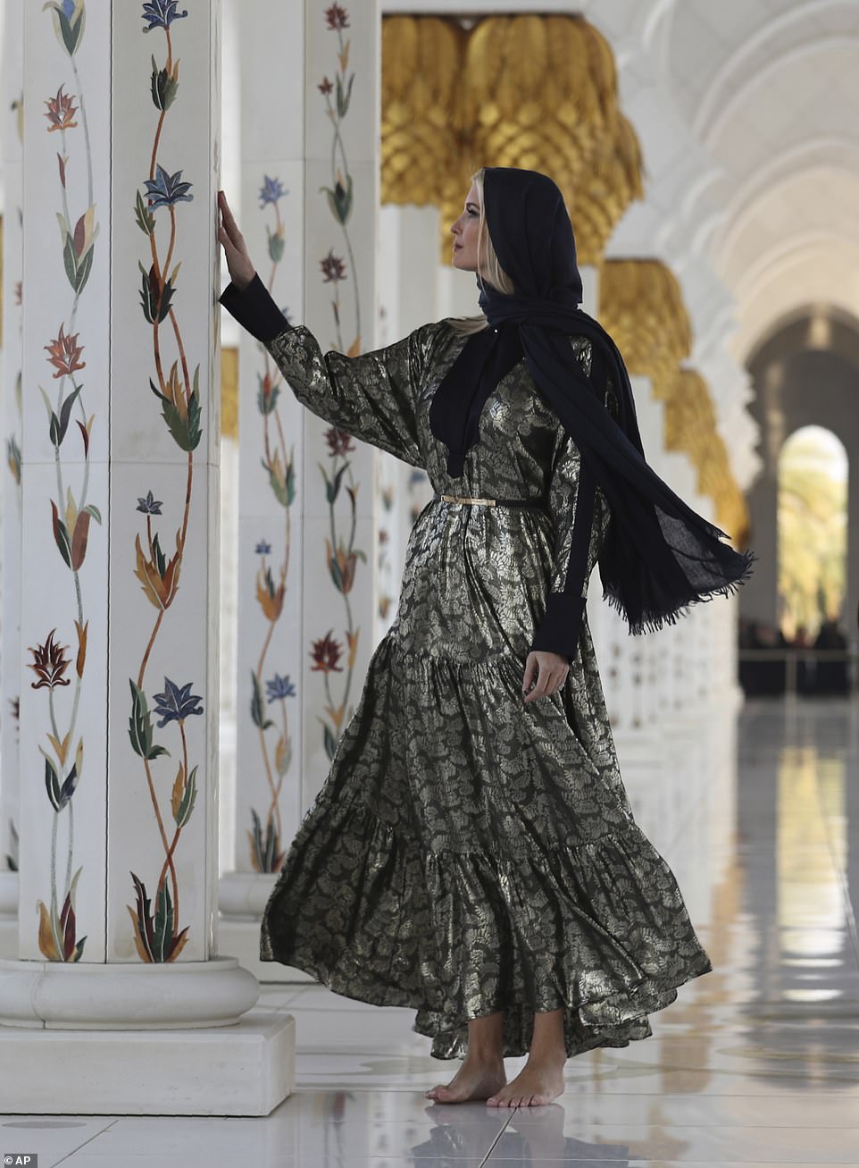 The blonde beauty - who converted to Orthodox Judaism upon her 2009 marriage to Jared Kushner - donned a headscarf and a modest metallic silk-blend dress for her visit to the Islamic place of worship.