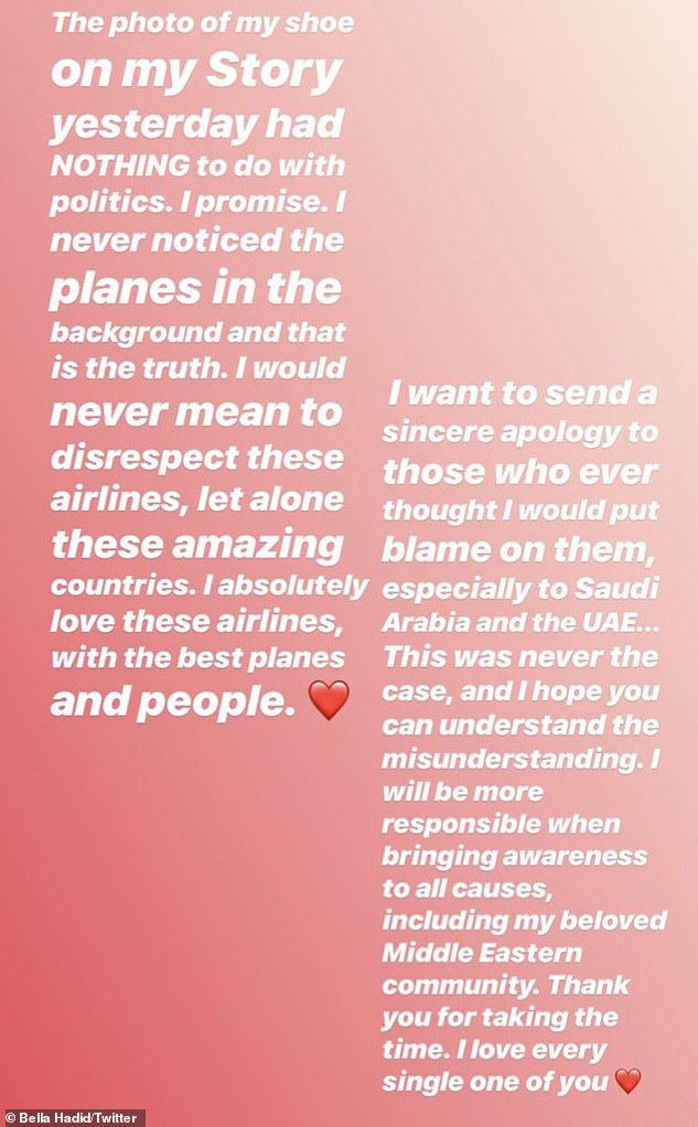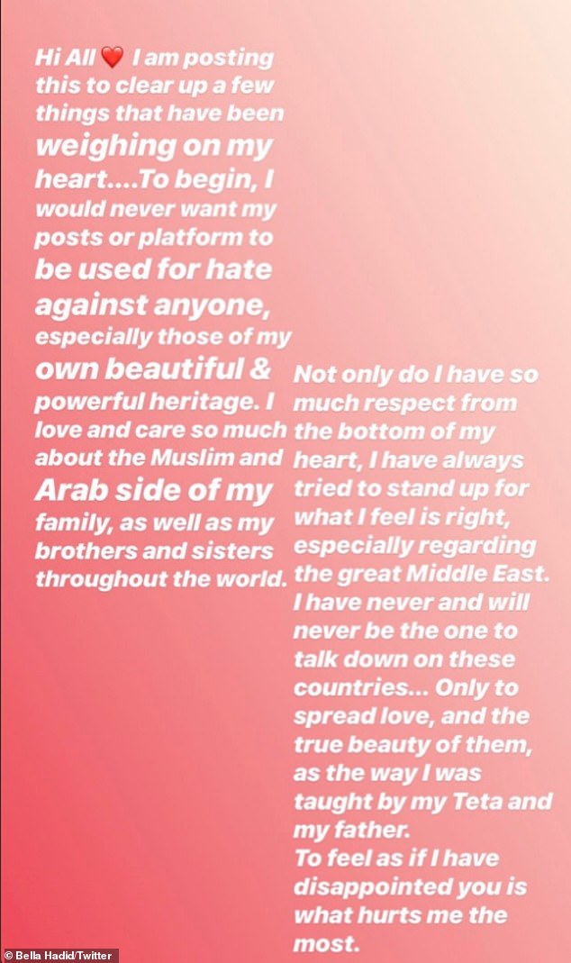 Apology: Bella's father is a Palestinian and she wrote that she 'would never want my posts or platform to be used for hate against anyone, especially those of my own beautiful & powerful heritage'