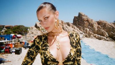 Part-Palestinian Hadid opted for a beige-toned dress with crystal-embellished cutouts at the elbows and a larger cutout in the back, paired with the brand’s marshmallow slides.