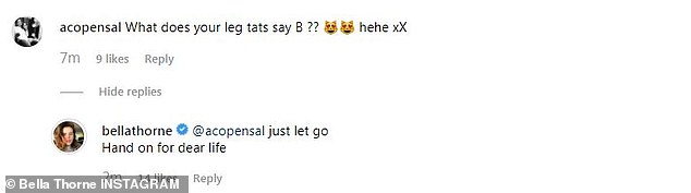 In response to a comment inquiring what the writing said, Bella wrote: 'just let go,' and 'Hand on for dear life'.