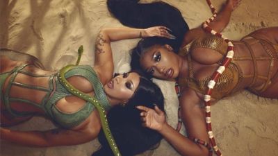 Lebanese designer Nicolas Jebran also created two coordinating looks, one for Megan and one for Cardi, for the new video.