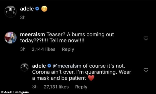 Quick to put rumours to bed, Adele responded: 'of course it's not. Corona ain't over. I'm quarantining. Wear a mask and be patient.'