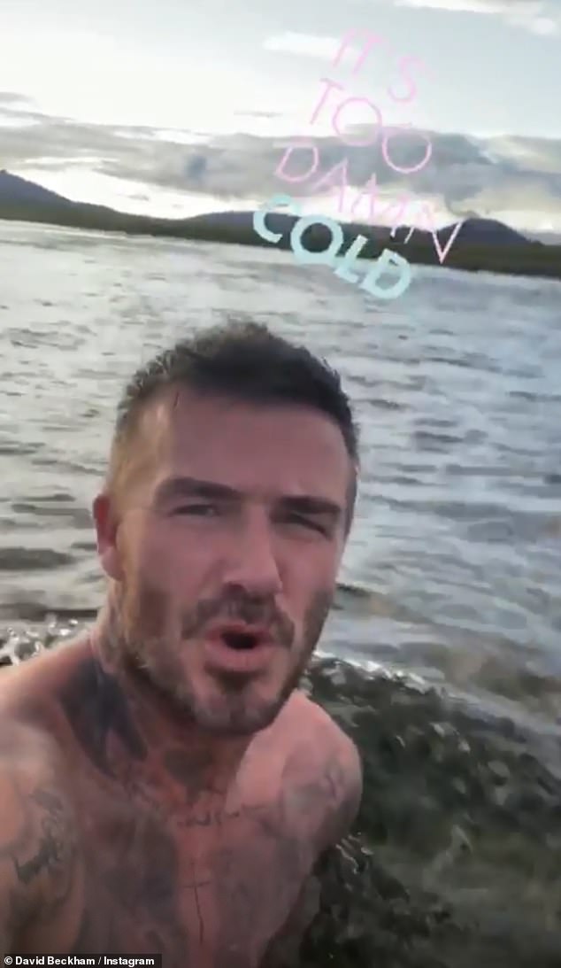 David then decided to submerge himself in the freezing Icelandic water, and shared a clip of himself breathing heavily, alongside the caption: 'Too damn cold.'
