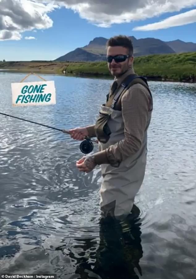 'Gone fishing': David looked like he was having the time of his life, as he began the day in full fishing gear to get his catch of the day