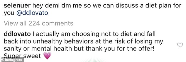 After being tagged in a post showing a pic of herself in workout gear with the message 'hey demi dm me so we can discuss a diet plan for you @ddlovato,' the Sorry Not Sorry singer responded back: 'I actually am choosing not to diet and fall back into unhealthy behaviors at the risk of losing my sanity or mental health but thank you for the offer! Super sweet.'