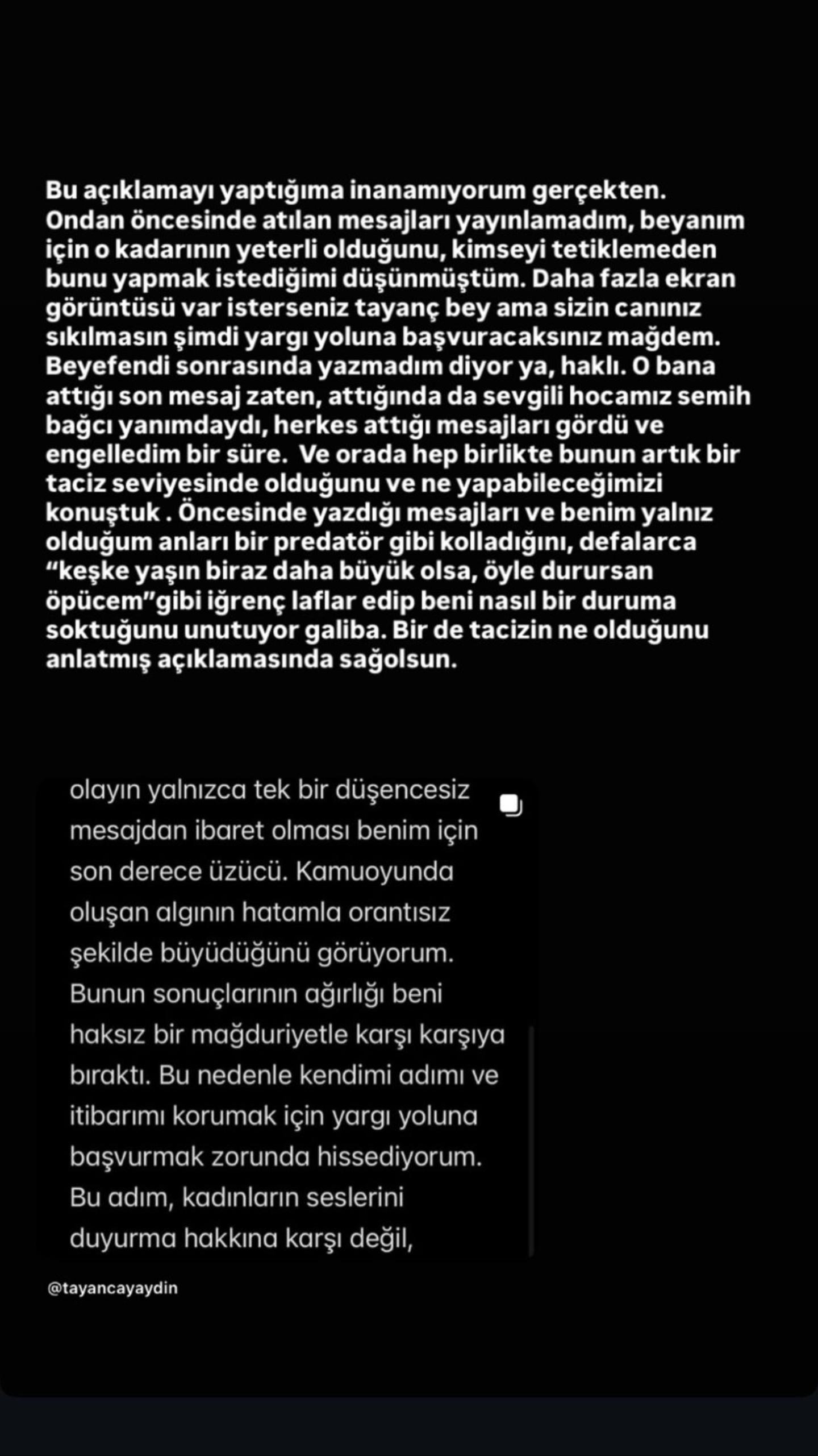 "I honestly can't believe I made this statement. I didn't publish the messages sent before that; I thought that was enough for my statement. Mr. Tayanç, if you'd like more screenshots, but don't worry, since you're going to take legal action now. Mr. Akkaya is right when he says he didn't send any messages afterward. Everyone saw the messages he sent, and I blocked him for a while. And there, we all discussed how this had escalated to harassment and what we could do. I think he's forgetting the preceding messages, the way he watched for me when I was alone, and the way he repeatedly made disgusting remarks like, 'I'll kiss you if you stand there,' and the situation he put me in."